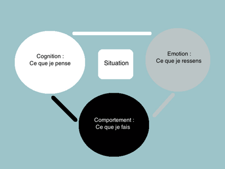Les TCC sont des thérapies brèves, validées scientifiquement qui portent sur les interactions entre pensées, émotions et comportements (pouvant créer un cercle vicieux, cf. image). « Les difficultés psychologiques sont liées à des pensées ou comportements inadéquats qui ont été appris par une personne au cours de son histoire personnelle. »